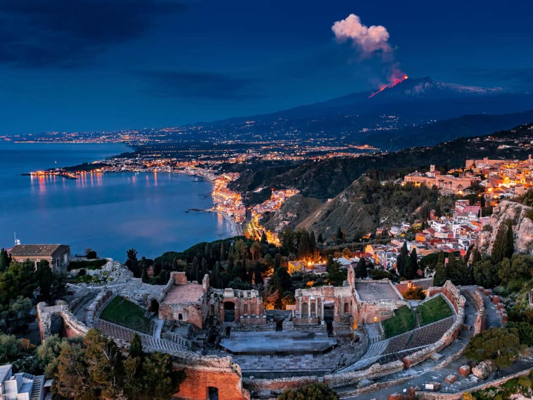 Dalle gradinate in pietra lo sguardo si apre su uno dei panorami più iconici del Mediterraneo: il profilo maestoso dell’Etna all’orizzonte e, più in basso, il Mar Ionio che riflette la luce in infinite sfumature.