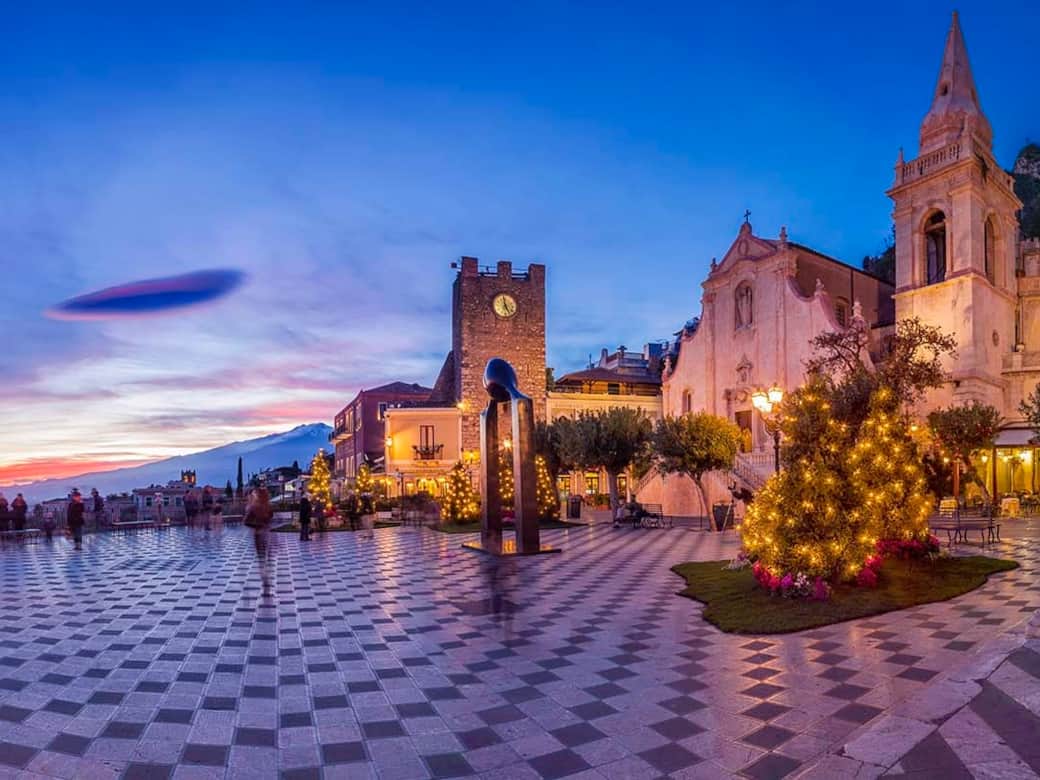 L’apertura improvvisa sulla piazza sorprende ogni volta. Il bianco e nero della pavimentazione dialoga con l’azzurro intenso del Mar Ionio e con il profilo imponente dell’Etna, spesso innevato. Sedersi in uno dei caffè storici e lasciarsi avvolgere dalla luce del pomeriggio è un rito senza tempo.